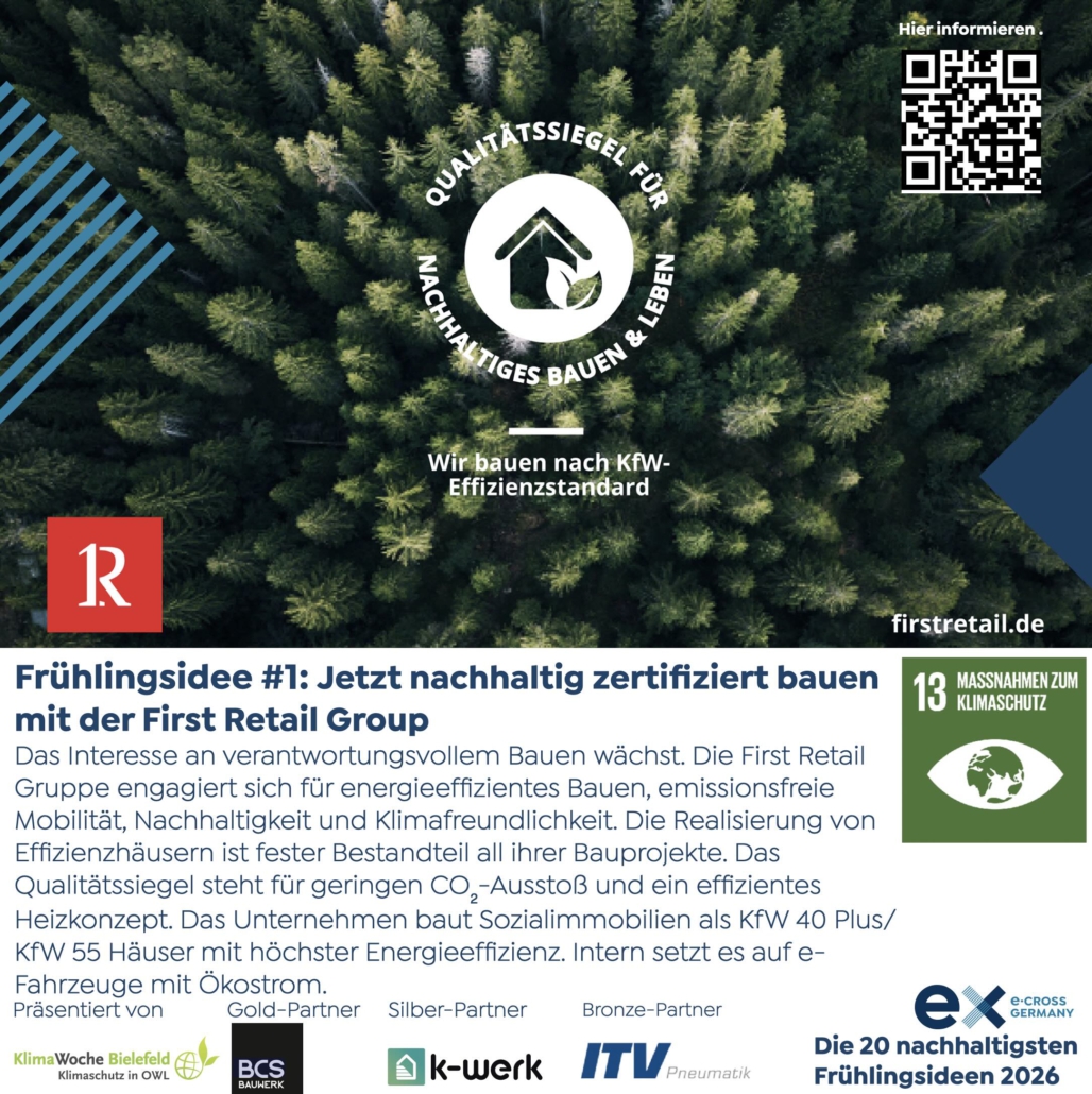 Das Interesse an verantwortungsvollem Bauen wächst. Die First Retail Gruppe engagiert sich für energieeffizientes Bauen, emissionsfreie Mobilität, Nachhaltigkeit und Klimafreundlichkeit. Die Realisierung von Effizienzhäusern ist fester Bestandteil all ihrer Bauprojekte. Das Qualitätssiegel steht für geringen CO₂-Ausstoß und ein effizientes Heizkonzept. Das Unternehmen baut Sozialimmobilien als KfW 40 Plus/ KfW 55 Häuser mit höchster Energieeffizienz. Intern setzt es auf e-Fahrzeuge mit Ökostrom.