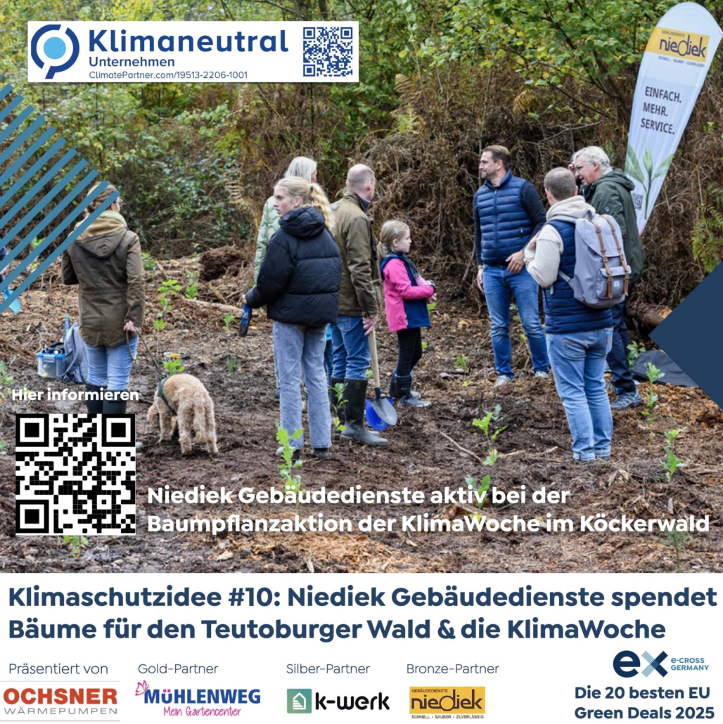 Niediek Gebäudedienste ist ein klimaneutrales Unternehmen und engagiert sich zudem für die regionale Wiederaufforstung und hat für jede/n Verwaltungsangestellte/n einen Baum 🌳 für den Teutoburger Wald und die KlimaWoche Bielefeld gespendet.